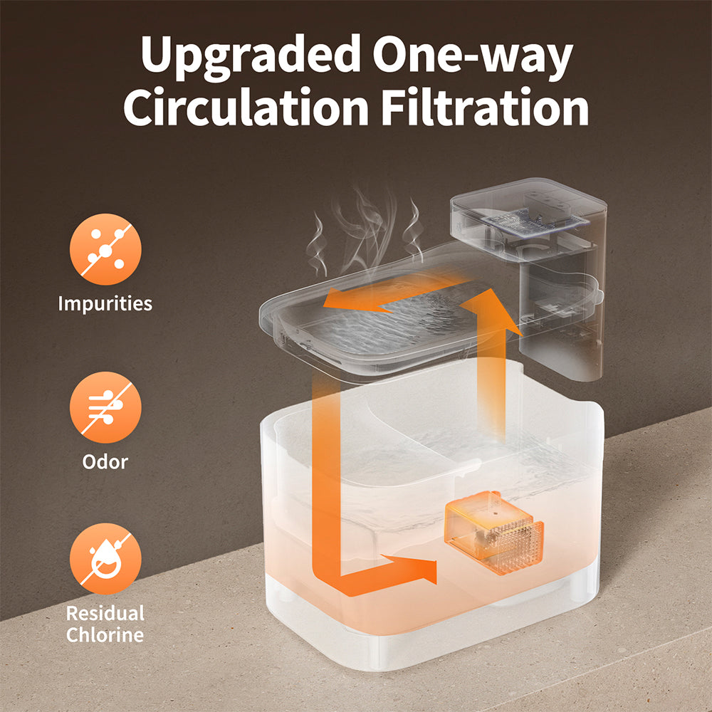 Equipped with a 304 stainless steel water tray and heat-resistant, BPA-free materials, the fountain is hygienic, durable, and easy to clean. The innovative tilt design of the tray helps remove floating hair, preventing water stagnation and promoting healthy drinking habits.