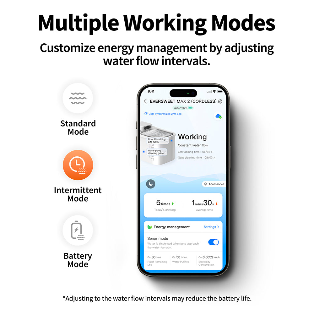 Smart app control via Bluetooth enables you to choose from multiple drinking modes, monitor your pet’s drinking patterns, and receive alerts for low water, filter replacement, or battery status. The fountain also features an automatic safety shutoff to prevent dry running, giving you peace of mind while your pets enjoy fresh water. EverSweet Max 2 combines convenience, safety, and smart technology, making it the ultimate hydration solution for cats and small-to-mid-size dogs.