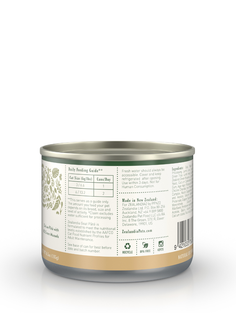 New Zealand Wild Goat is hypoallergenic, free from any growth hormones, and antibiotics. Goat Pate Cat formula is slow cooked in a delicious broth, loaded with taste and delivering a whole new level of nourishment and satisfaction for your pet.